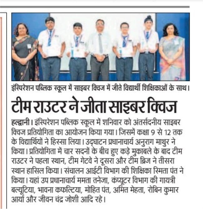Each quiz is an opportunity to transform questions into wisdom On August 30, 2025 Inter-House Cyber Quiz was organised for classes IX- XII. Each house team comprised of 4 members one from each class. There were 6 Rounds: 1) Ice-breaker Round 2) Multiple choice Questions. 3) Arrange in sequence 4) Hands on Practice (MySQL) 5) Audio-Visual Infotainment (Buzzer Round) 6) Rapid fire The questions of the quiz were a mix bag based on various topics like shortcut keys, memory unit, conversions, protocols, Network devices, AI, ICT skills, Chat GPT/ chatbots, CEO's of ICT Based Companies, open source softwares, file extensions etc. All the four teams competed well. The deciding rounds were Buzzer round and Rapid fire since they had negative marking for the wrong answer. It was a rich learning experience for all. At the end of each round, there were questions for audience also. After all the 6 mind boggling rounds, Green house stood first followed by Yellow and third place was bagged by the Red house. The program was witnessed by the school Principal Mr. Anurag Mathur and Vice Principal Ms. Mamta Taneja and Ms. Gayatri Balutia. The winners were felicitated by medals and certificates. Ms Smita Pant was the quiz master.