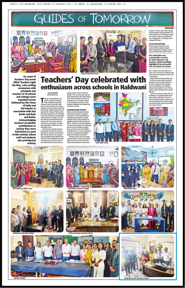 “Teachers can change lives with just the right mix of chalk and challenge.” The teaching fraternity of Inspiration Senior Secondary School celebrated Teachers’ Day in the school auditorium and paid a tribute to the great teacher of all times Dr. Sarvapalli Radhakrishnan on the occasion of his birth anniversary. The day was marked by the presence of the school Management Dr. Deepak Balutia and Dr. Geetika Balutia, the Principal Mr. Anurag Mathur, Vice Principal Ms. Mamta Taneja and the entire staff of the school. The celebration commenced with a floral offering to the portraits of Dr. Radhakrishnan and our Founder, Late Shri N.C. Balutia ji , the great visionary to mould young minds, whose birthday coincides fostering a chance for the school to salute him and promising to follow the path laid by him. This was followed by Saraswati Vandana by the IPS teacher-choir and a Guru Vandana Kathak performance by Ms. Neeru Goel. The show was hosted by Ms. Smita Pant. The celebration continued with various engaging fun-games, Group song by teachers, individual solo performance by Ms. Prairna Pandey, Mr. Manmohan Joshi, Ms. Madhumita Das, Ms. Prerna Joshi, Ms. Gunjan Joshi and Ms. Smita Pant. The solo performance by the Director sir Dr. Deepak Balutia (song Pal Pal Dil Ke Paas….) took the centre of all attractions and remained the show-stopper. Among the various games like Musical Ring, Musical Chair, Pick-up-first, the game of Tambola was enjoyed the most by all. Principal Mr. Anurag Mathur in his speech shared an eye-opening anecdote that was equally inspiring for all the teachers. Prizes were distributed to the winners of each game . The celebration came to an ane with song, dance and the grand lunch arranged by the school management. Thus the entire celebration paved a new hope for teachers to rejoice the journey of being a teacher